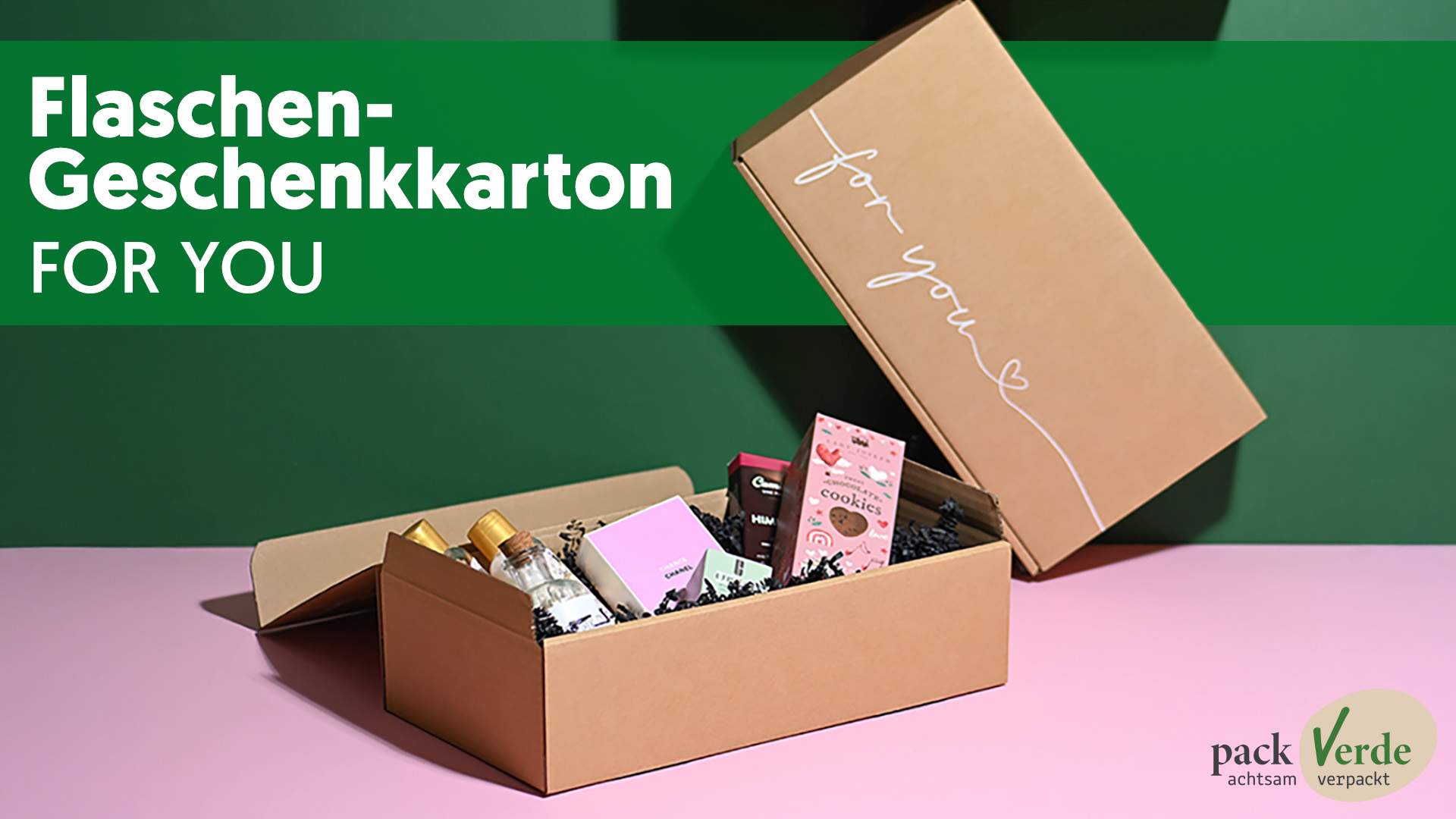 Der braune Geschenkkarton mit modernem, weißem «for you»-Schriftzug vereint Stil und Funktion. Die variable Wellpappeinlage sorgt für sicheren Halt der Flaschen – oder lässt sich einfach entnehmen, um andere Geschenke zu verpacken.